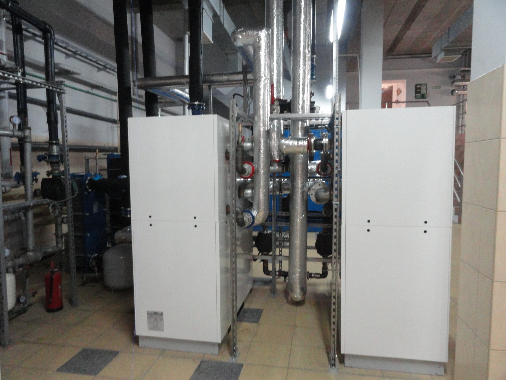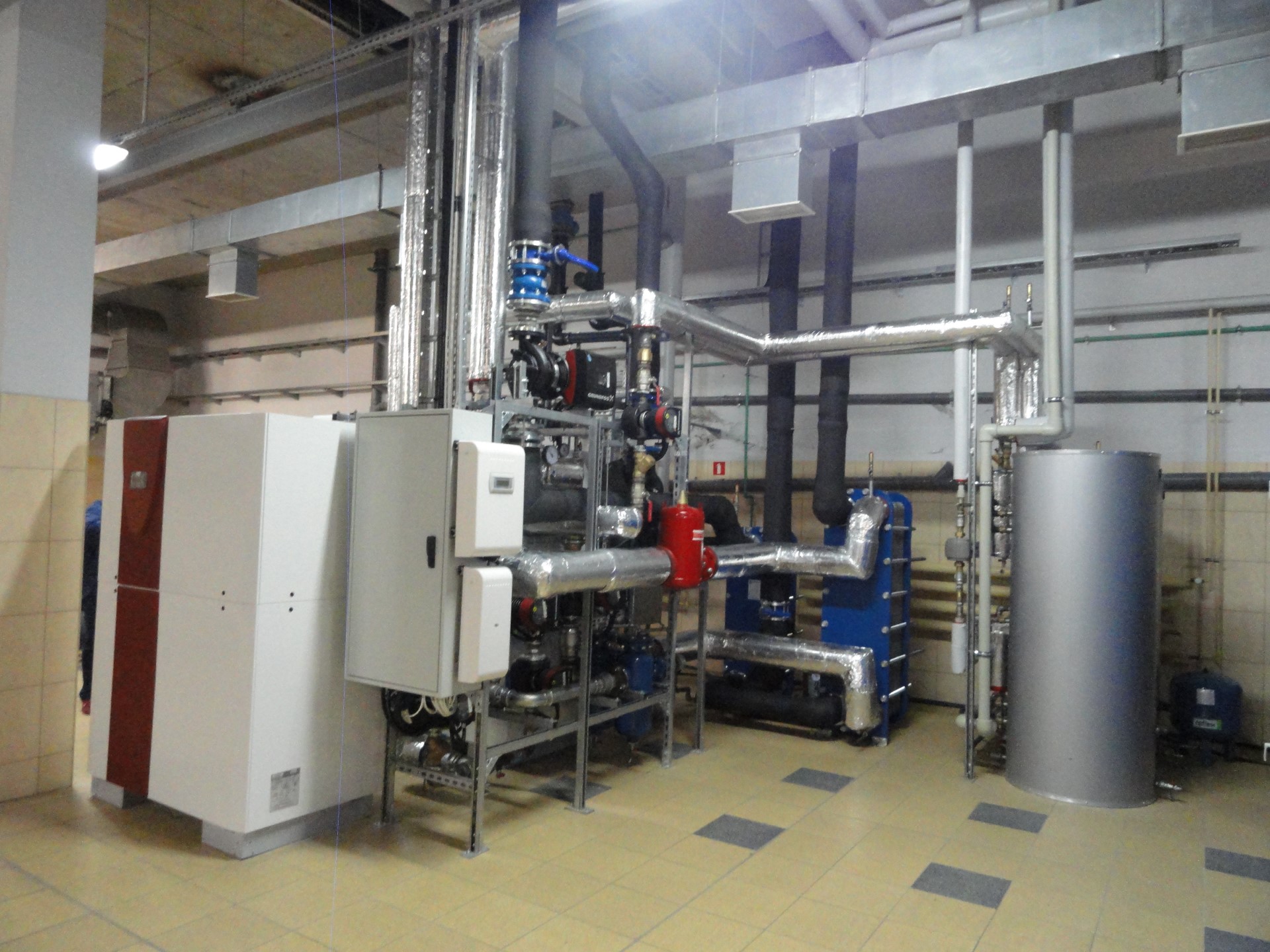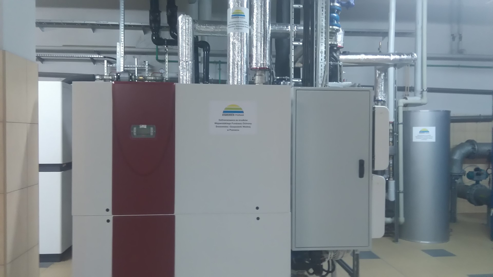 Moc grzewcza pomp ciepła pokrywa 100% zapotrzebowania budynków na ciepło i chłód. – dwie pompy ciepła o łącznej mocy grzewczej 180 kW (2 x 90 kW), które produkować będą energię cieplną dla potrzeb ogrzewania, wentylacji, chłodu oraz przygotowania c.w.u. |