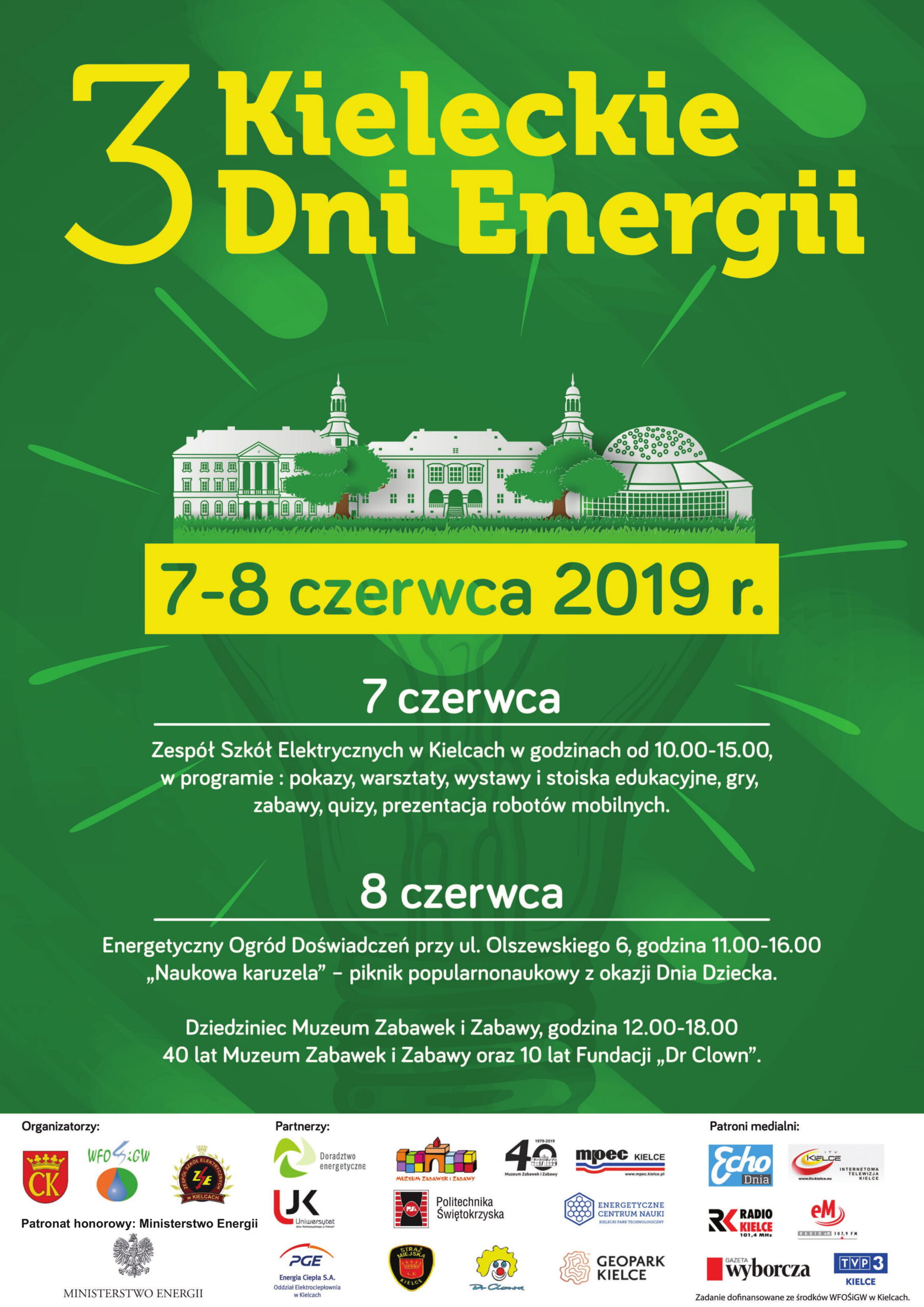 W dniu 7 czerwca 2019 odbędzie się impreza edukacyjno-informacyjna poświęcona poprawie efektywności energetycznej oraz OZE. Rozpocznie się o godzinie 10tej w Zespole Szkół Elektrycznych w Kielcach. Do udziału w wydarzeniu zapraszamy uczniów w wieku od 8 do 15 lat wraz z nauczycielami. Na najmłodszych uczestników czeka wiele atrakcji między innymi: kino Hybrydowe zasilane energią wytworzona przy użyciu mięśni, wystawę poświęconą problemowi zmian klimatycznych, pokazującą w jaki sposób każdy z nas może dbać o klimat na ziemi, solarną pracownię edukacji ekologicznej, w której uczestnicy korzystając z pracowni komputerowej zasilanej modułami fotowoltaicznymi będą mogli zapoznać się z zaletami OZE, EKO Memory – gry planszowe, którym towarzyszy edukacja ekologiczna oraz Eko Puzzle – wielkoformatowe puzzle na temat chronionych gatunków roślin i zwierząt. Przez cały dzień na przygotowanych stoiskach czekają na najmłodszych do rozwiązania krzyżówki, labirynty, zagadki oraz wiele innych gier, quizów i zabawy z energią.